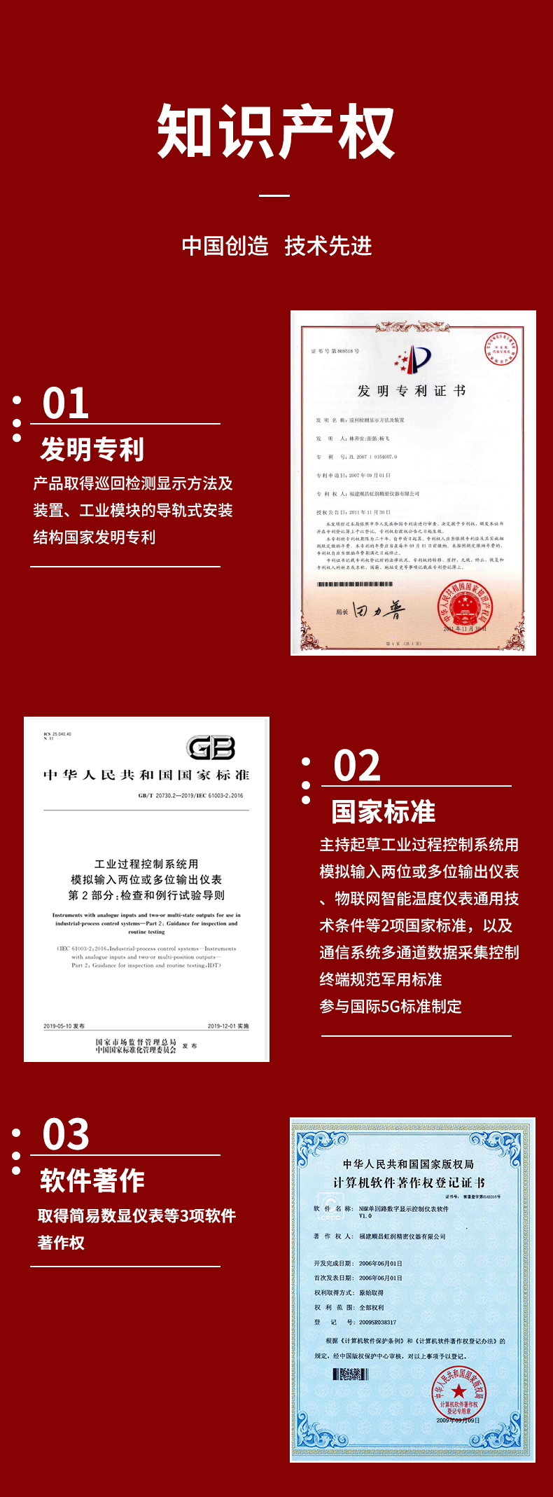 虹潤公司是專業(yè)生產(chǎn)數(shù)顯表的國家專精特新“小巨人”企業(yè),生產(chǎn)的導(dǎo)軌式數(shù)顯儀表,具有全切換信號輸入,導(dǎo)軌壁掛共用,全隔離設(shè)計,高抗干擾,變送輸出或RS485通訊等特點。產(chǎn)品獲得巡回檢測顯示方法及裝置、工業(yè)模塊的導(dǎo)軌式安裝結(jié)構(gòu)等2項國家發(fā)明專利,主持起草工業(yè)過程控制系統(tǒng)用模擬輸入兩位或多位輸出儀表、物聯(lián)網(wǎng)智能溫度儀表通用技術(shù)條件等2項國家標(biāo)準(zhǔn),,以及通信系統(tǒng)多通道數(shù)據(jù)采集控制終端規(guī)范軍用標(biāo)準(zhǔn),參與國際5G標(biāo)準(zhǔn)制定,取得簡易數(shù)顯儀表等3項相關(guān)軟件著作權(quán)。產(chǎn)品廣泛應(yīng)用于電力、石化、冶金、化工、造紙、食品、輕工、制藥、熱處理、水處理、機械配套等各種工業(yè)現(xiàn)場。