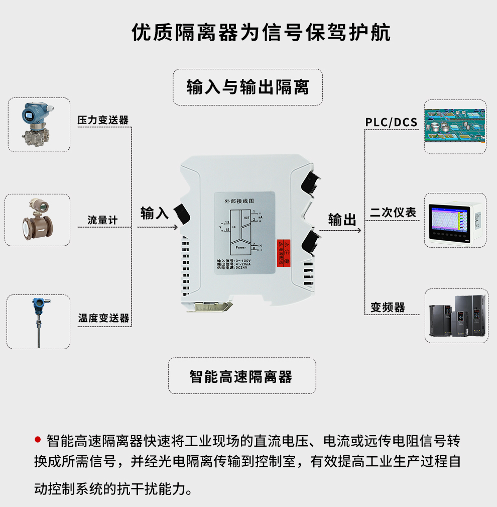 OHR-M38系列智能高速隔離器將工業(yè)現(xiàn)場的直流電壓、電流或遠傳電阻信號轉(zhuǎn)換成所需信號,經(jīng)隔離傳輸?shù)娇刂剖?,有效提高工業(yè)生產(chǎn)過程自動控制系統(tǒng)的抗干擾能力。