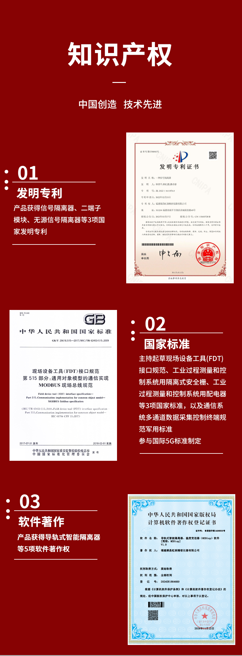 虹潤公司是專業(yè)生產(chǎn)隔離器的國家專精特新“小巨人”企業(yè)。生產(chǎn)的智能信號隔離器涵蓋電流電壓變送器、溫度變送器、配電器、頻率轉(zhuǎn)換器、開關(guān)量轉(zhuǎn)換器及通訊轉(zhuǎn)換器等多種產(chǎn)品類型。產(chǎn)品獲得信號隔離器、一種二端子模塊、無源信號隔離器等3項國家發(fā)明專利,主持起草現(xiàn)場設(shè)備工具(FDT)接口規(guī)范、工業(yè)過程測量和控制系統(tǒng)用隔離式安全柵、工業(yè)過程測量和控制系統(tǒng)用配電器等3項國家標(biāo)準(zhǔn),以及通信系統(tǒng)多通道數(shù)據(jù)采集控制終端規(guī)范軍用標(biāo)準(zhǔn),參與國際5G標(biāo)準(zhǔn)制定,取得導(dǎo)軌式智能隔離器、頻率轉(zhuǎn)換器等3項相關(guān)軟件著作權(quán)。產(chǎn)品廣泛電力、冶金、工業(yè)電爐、變電站、高壓電機(jī)房等需要電隔離的工業(yè)自動化控制系統(tǒng)。
