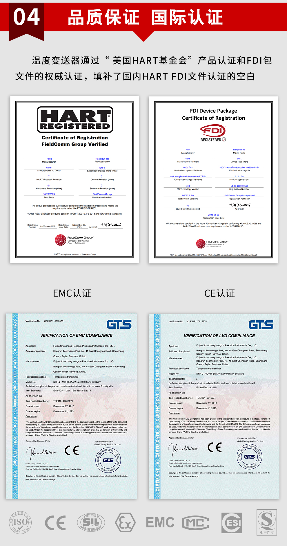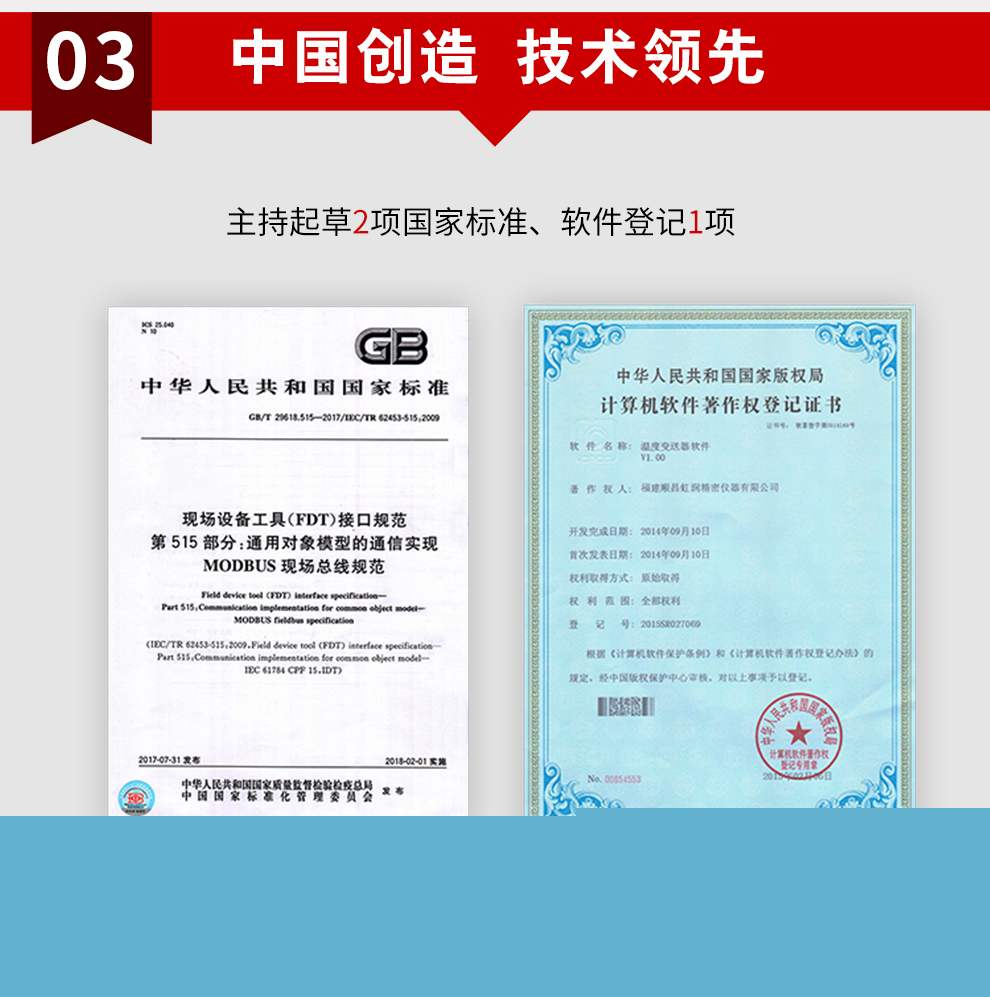 虹潤公司是專業(yè)生產溫度變送器的國家專精特新“小巨人”企業(yè)。生產的現(xiàn)場顯示隔離溫度變送器,具有可修改輸入信號類型,測量精度高,穩(wěn)定性好,帶HART或RS485通訊計等特點。該產品不僅通過德國萊茵 CE 認證與 SIL 功能安全認證,還獲得具備減震抗干擾能力的溫度變送器、信號隔離器、一種二端子模塊、無源信號隔離器等3項國家發(fā)明專利。主持起草物聯(lián)網智能溫度儀表、現(xiàn)場設備工具(FDT)接口規(guī)范、工業(yè)過程測量和控制系統(tǒng)用溫度變送器等3項國家標準,以及通信系統(tǒng)多通道數(shù)據采集控制終端規(guī)范軍用標準。參與國際5G標準制定,取得高精度溫度變送器等3項相關軟件著作權。產品廣泛應用于石油、化工、電力、冶金、制藥、食品、水處理等各種工業(yè)領域。